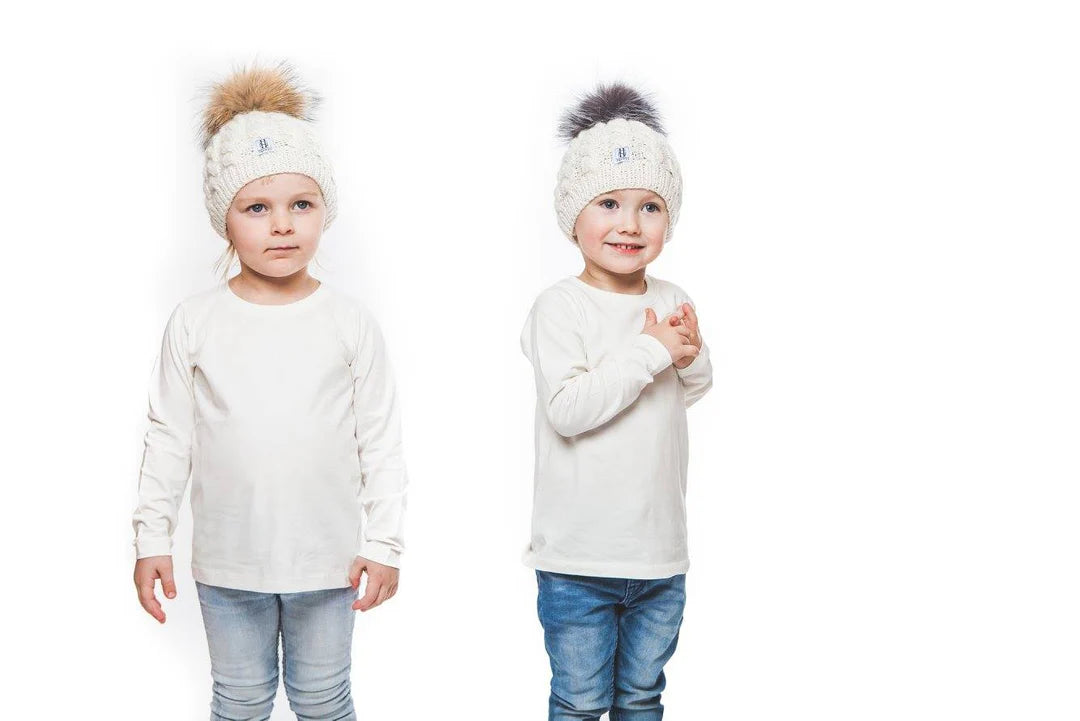 Vönduð handprjónuð kaðlahúfa úr mjúkri alpakka ull. Húfan er hlý, mjúk og heldur sér vel. Hún er með ekta dúsk sem hægt er að smella af og þá er hægt að þvo húfuna á ullarþvotti í þvottavél.