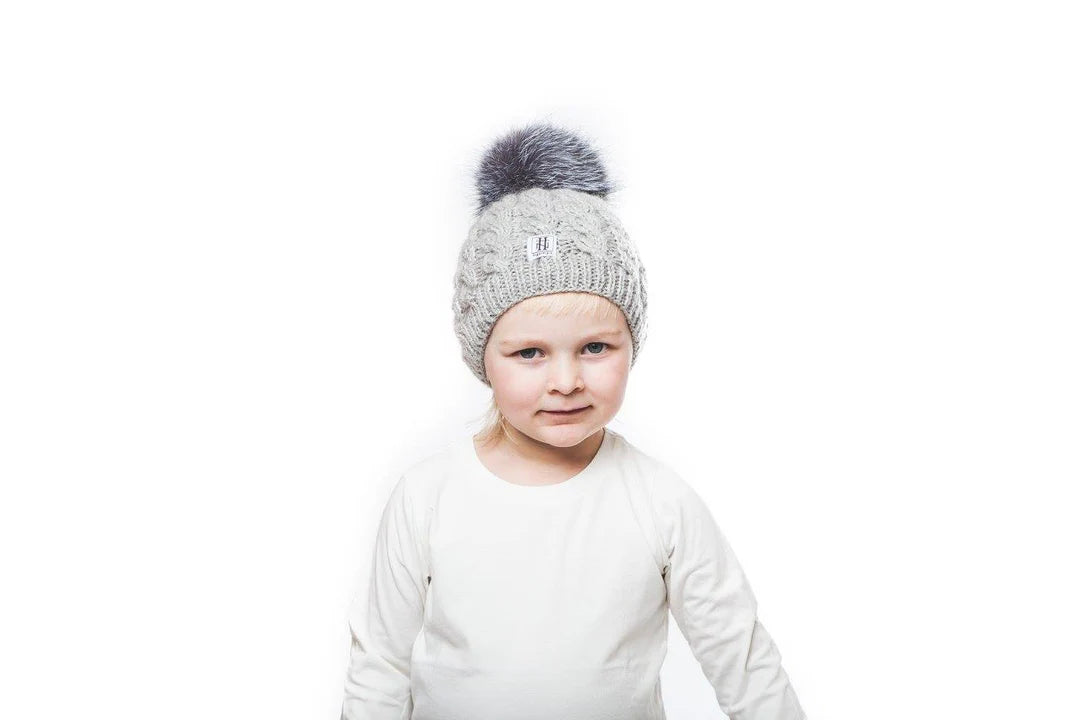Vönduð handprjónuð kaðlahúfa úr mjúkri alpakka ull. Húfan er hlý, mjúk og heldur sér vel. Hún er með ekta dúsk sem hægt er að smella af og þá er hægt að þvo húfuna á ullarþvotti í þvottavél.