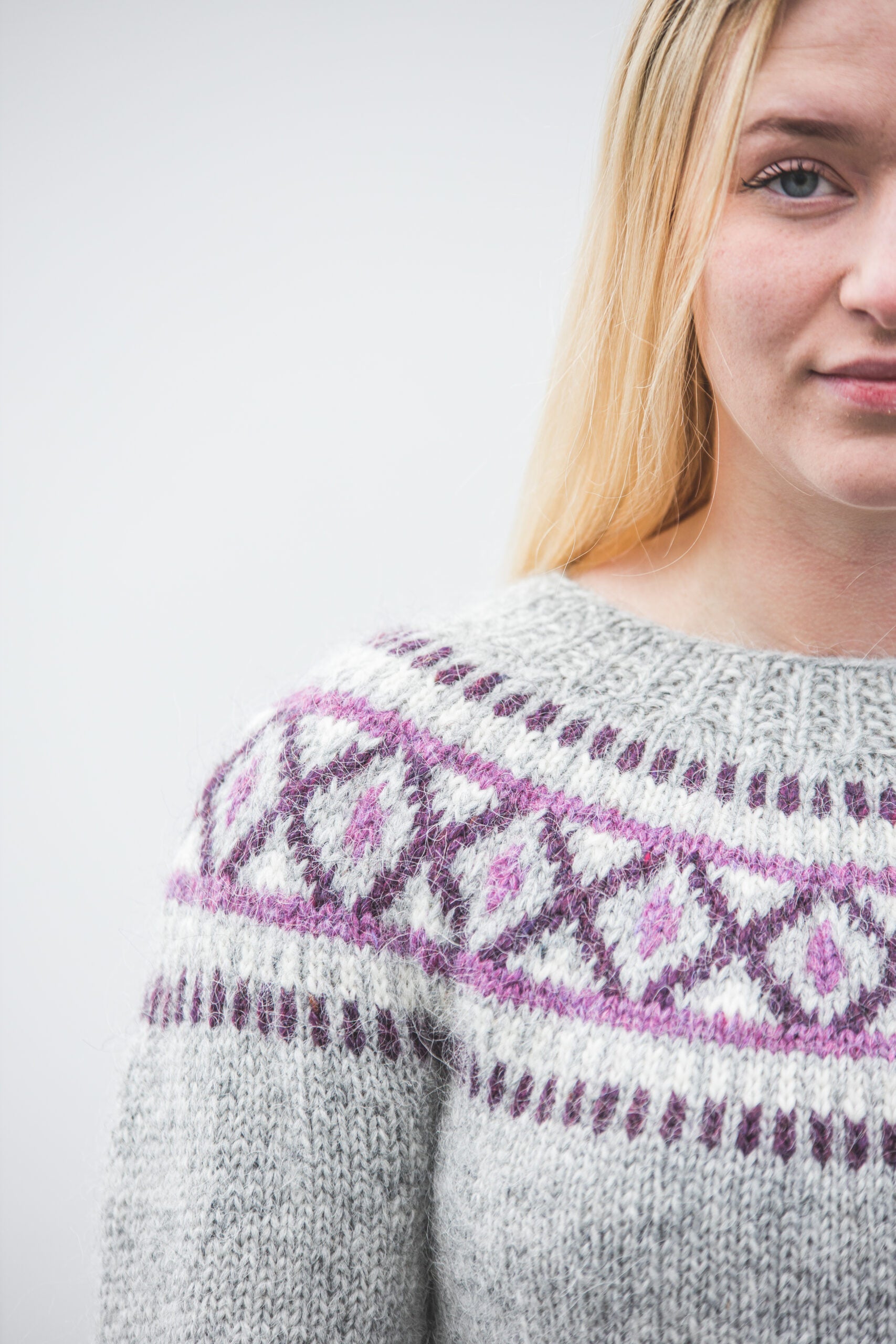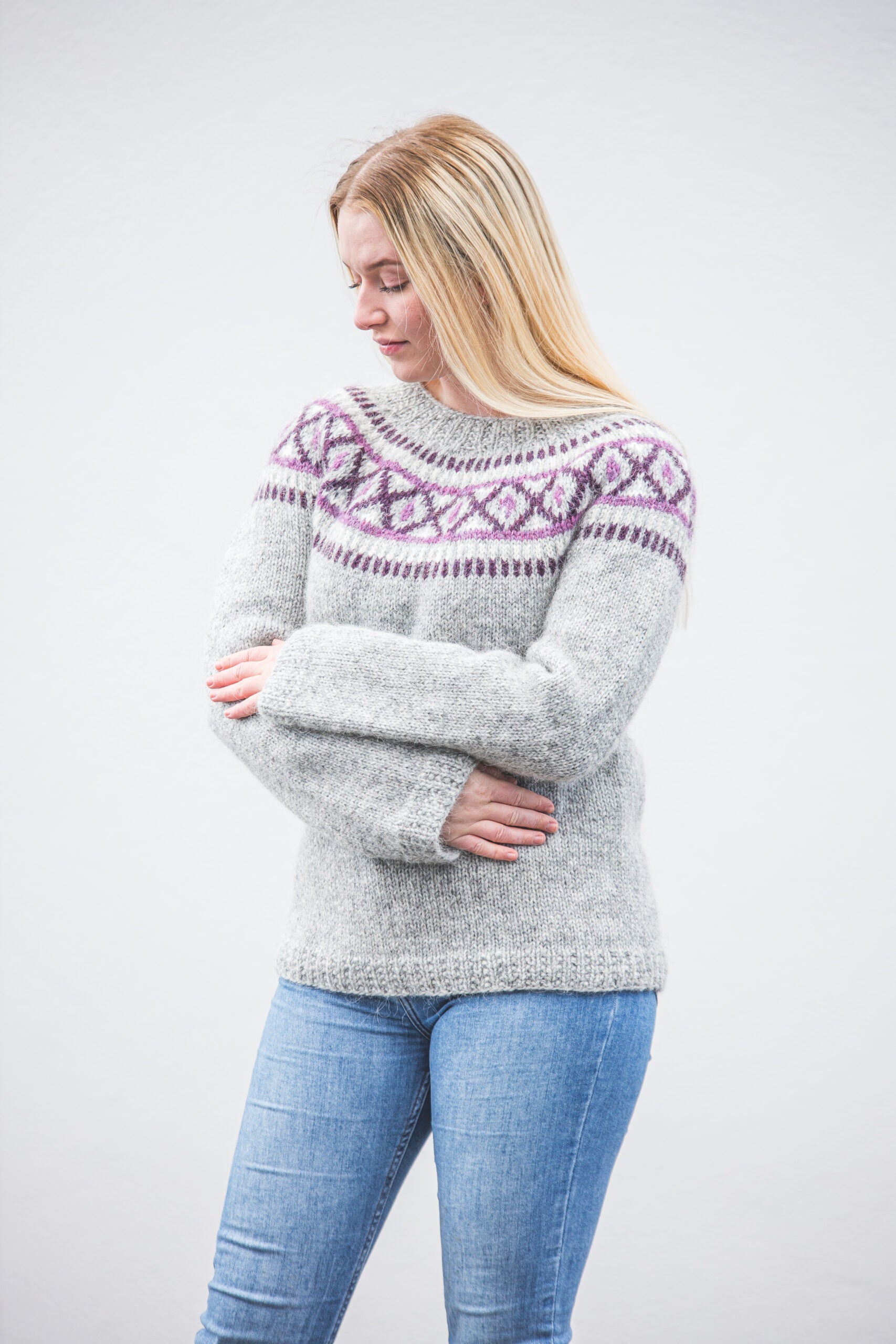 Létt, þægileg og einstaklega klæðileg handprjónuð lopapeysa úr íslenskum lopa.