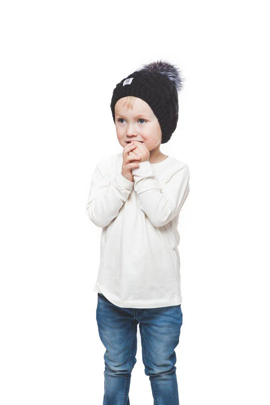 Vönduð handprjónuð kaðlahúfa úr mjúkri alpakka ull. Húfan er hlý, mjúk og heldur sér vel. Hún er með ekta dúsk sem hægt er að smella af og þá er hægt að þvo húfuna á ullarþvotti í þvottavél.