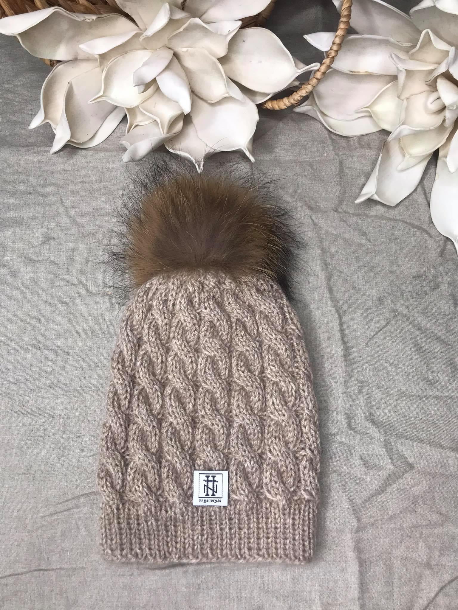 Vönduð handprjónuð kaðlahúfa úr mjúkri alpakka ull og silki mohair þræði. Húfan er hlý, mjúk og heldur sér vel. Hún er með ekta dúsk sem hægt er að smella af og þá er hægt að þvo húfuna á ullarþvotti í þvottavél. Húfurnar bera allar heiti úr íslenskri náttúru.