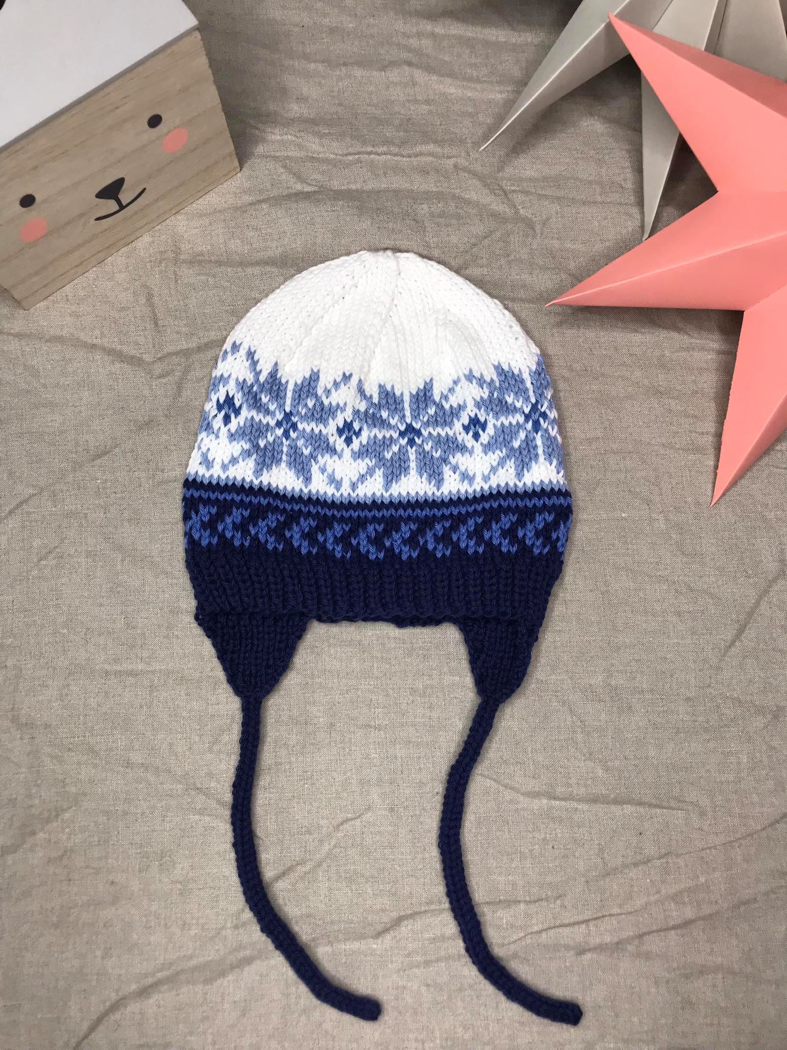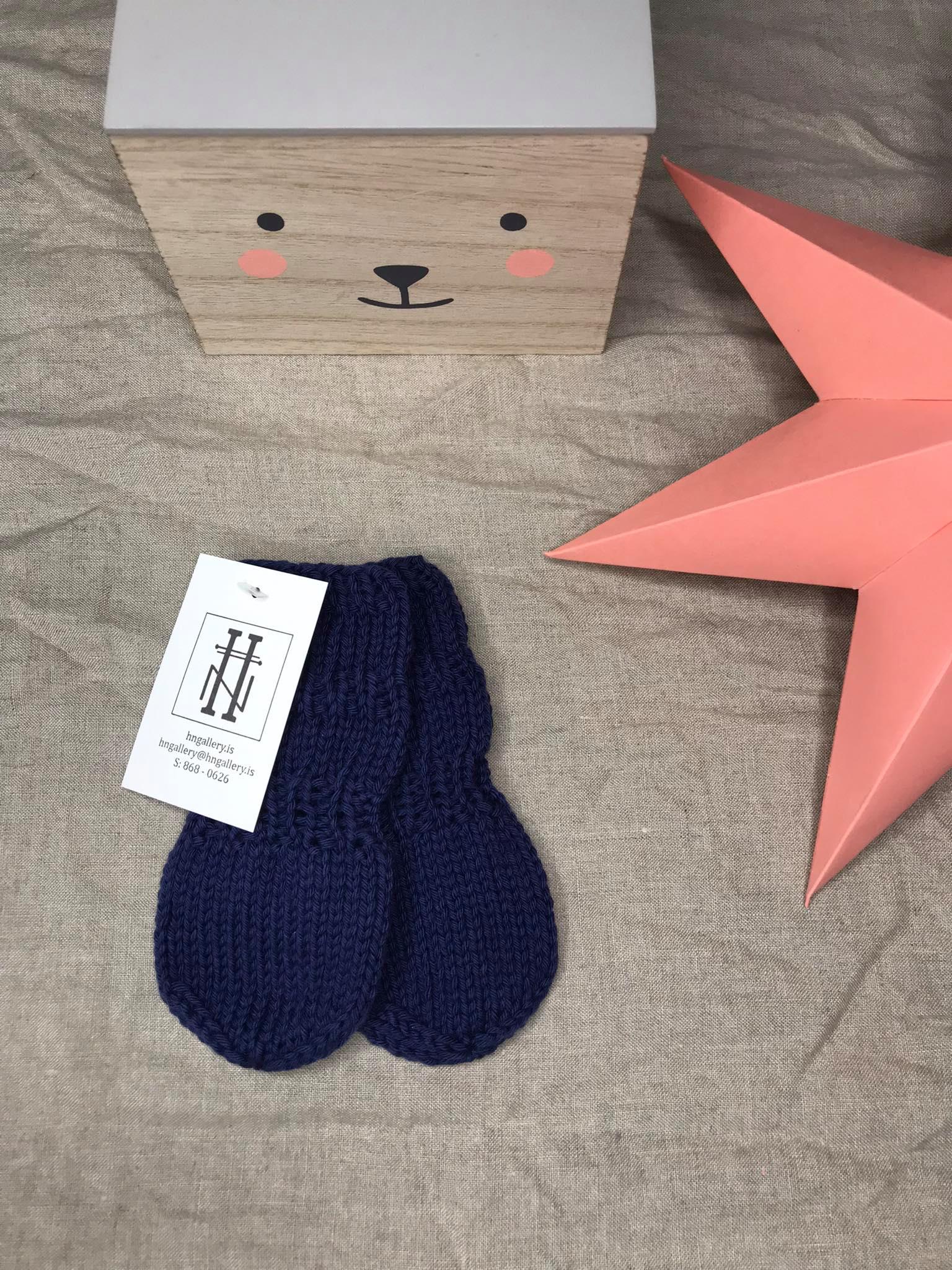 Yndislega mjúkt og gott ungbarnagjafasett sem er handprjónað úr mjúku bómullargarni. Snið húfunnar er einstaklega gott, svo hún situr vel á höfði barnsins og vettlingarnir eru uppháir svo þeir detta ekki auðveldlega af litlum höndum.
