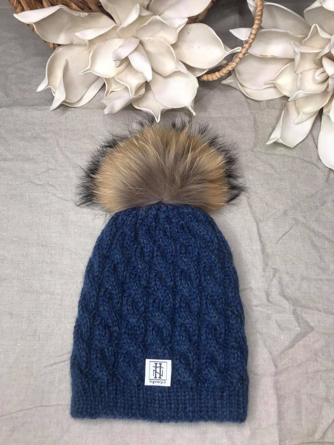 Vönduð handprjónuð kaðlahúfa úr mjúkri alpakka ull og silki mohair þræði. Húfan er hlý, mjúk og heldur sér vel. Hún er með ekta dúsk sem hægt er að smella af og þá er hægt að þvo húfuna á ullarþvotti í þvottavél. Húfurnar bera allar heiti úr íslenskri náttúru.