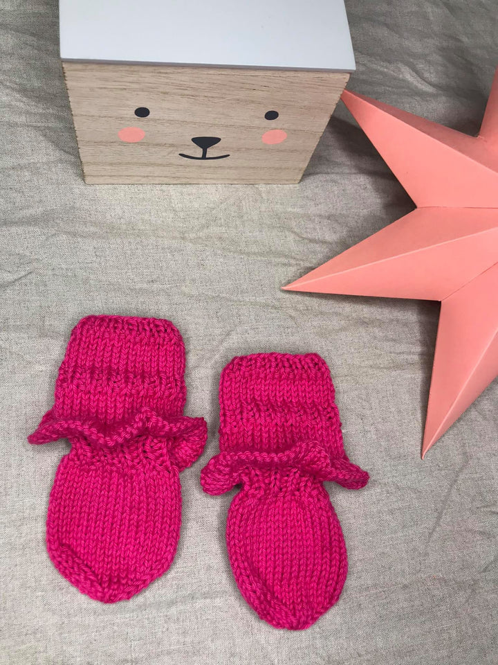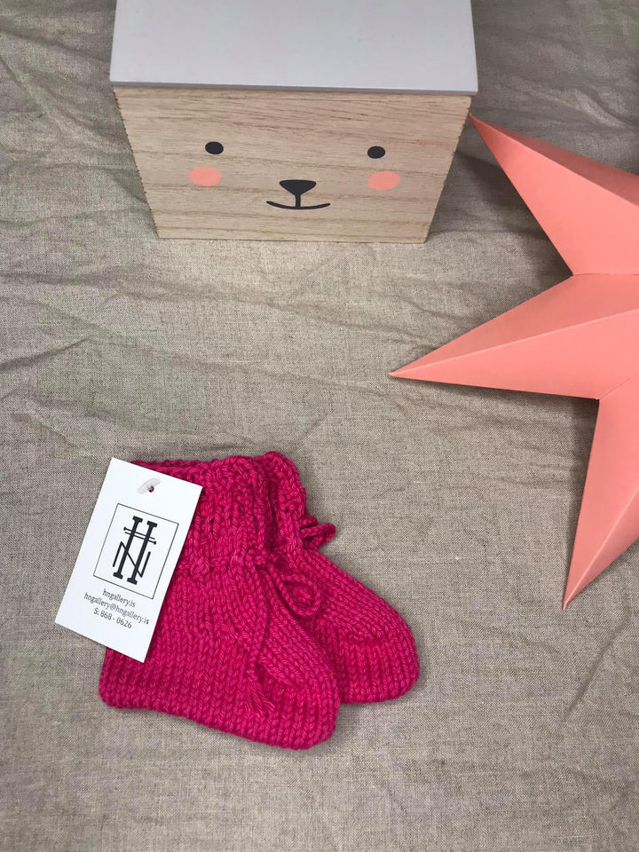 Yndislega mjúkt og gott ungbarnagjafasett sem er handprjónað úr mjúku bómullargarni. Vettlingarnir eru uppháir svo þeir detta ekki auðveldlega af litlum höndum og hosurnar eru með reimum svo þær haldast vel á litlum fótum.