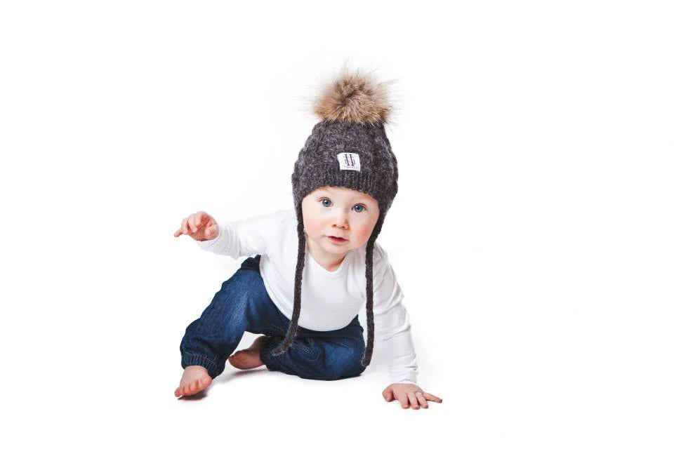 Vönduð handprjónuð kaðlahúfa úr mjúkri alpakka ull. Húfan er hlý, mjúk og heldur sér vel. Hún er með ekta dúsk sem hægt er að smella af og þá er hægt að þvo húfuna á ullarþvotti í þvottavél.