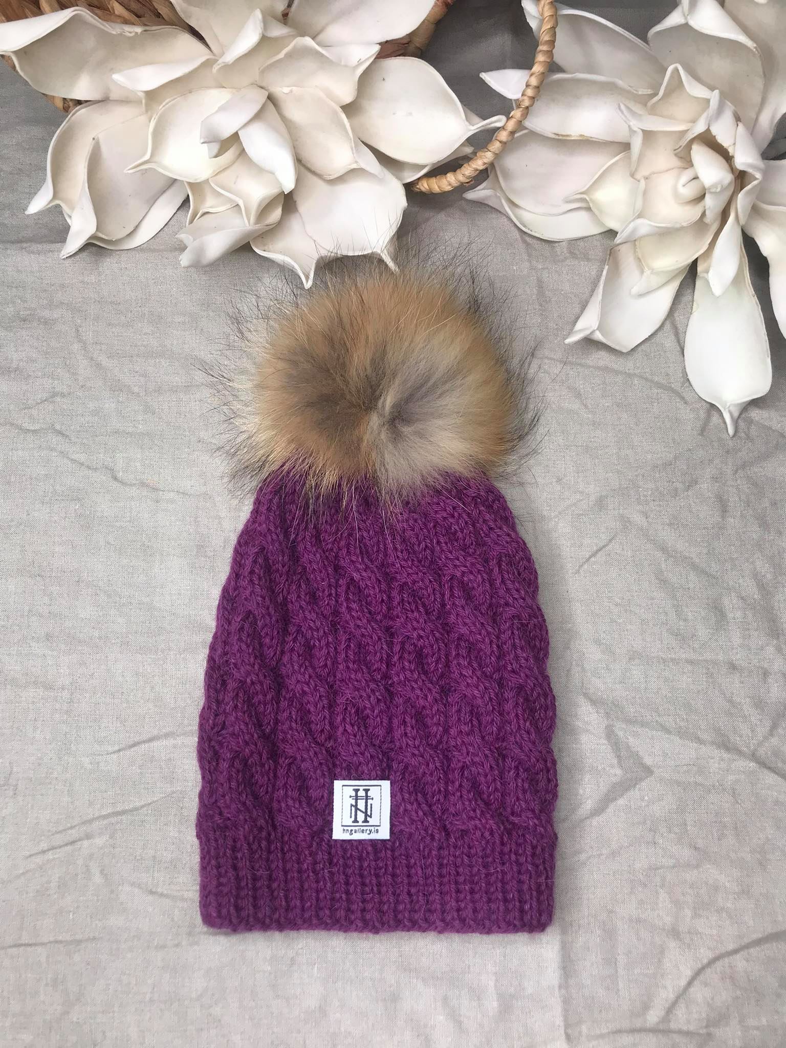 Vönduð handprjónuð kaðlahúfa úr mjúkri alpakka ull og silki mohair þræði. Húfan er hlý, mjúk og heldur sér vel. Hún er með ekta dúsk sem hægt er að smella af og þá er hægt að þvo húfuna á ullarþvotti í þvottavél. Húfurnar bera allar heiti úr íslenskri náttúru.