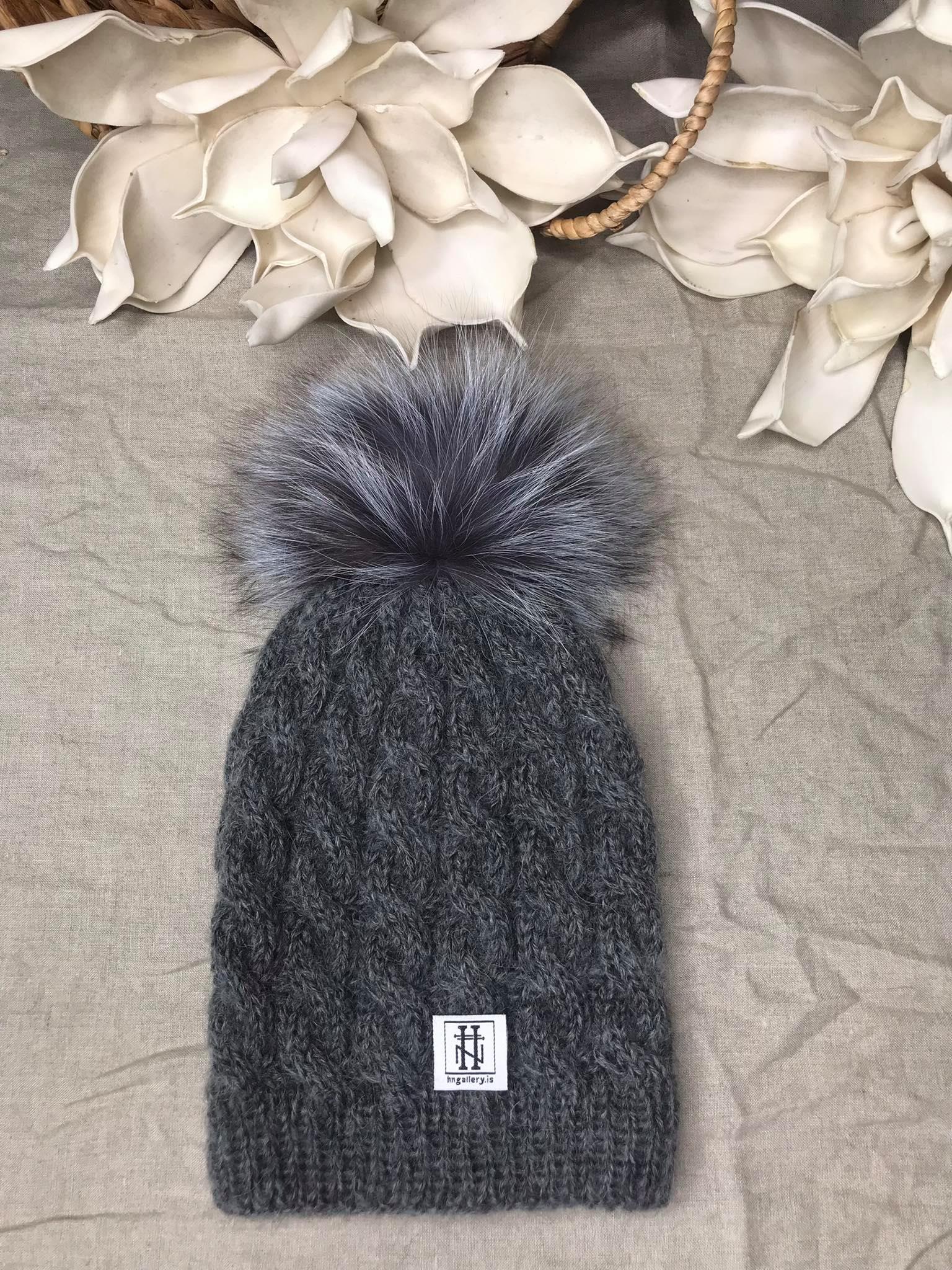 Vönduð handprjónuð kaðlahúfa úr mjúkri alpakka ull og silki mohair þræði. Húfan er hlý, mjúk og heldur sér vel. Hún er með ekta dúsk sem hægt er að smella af og þá er hægt að þvo húfuna á ullarþvotti í þvottavél. Húfurnar bera allar heiti úr íslenskri náttúru.