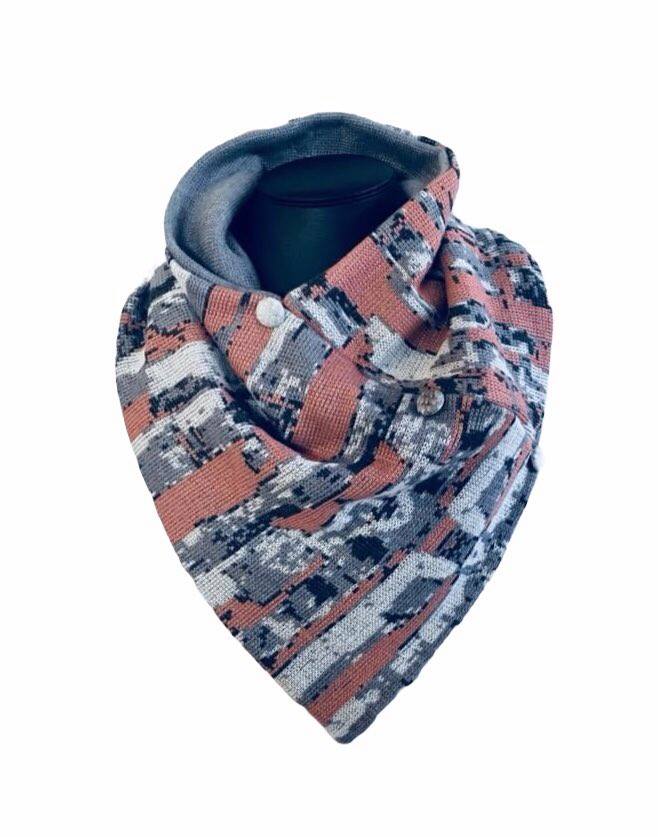 Yndislega mjúkur og góður kragi sem er saumaður úr ullarblöndu sem er vélprjónuð hér á Íslandi. Kraginn er léttur og góður. Kraginn er með einlitu gráu efni að innan og ísaumuðum hneppum sem eru gerðar úr íslensku laxaroði.