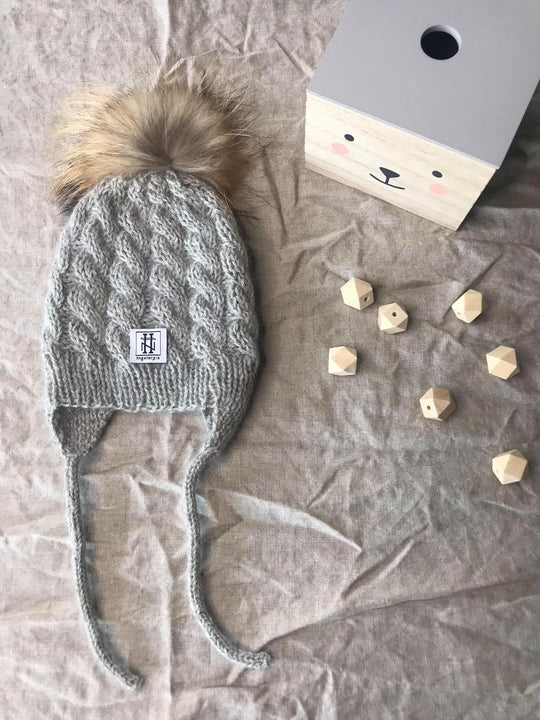 Vönduð handprjónuð kaðlahúfa úr mjúkri alpakka ull. Húfan er hlý, mjúk og heldur sér vel. Hún er með ekta dúsk sem hægt er að smella af og þá er hægt að þvo húfuna á ullarþvotti í þvottavél.