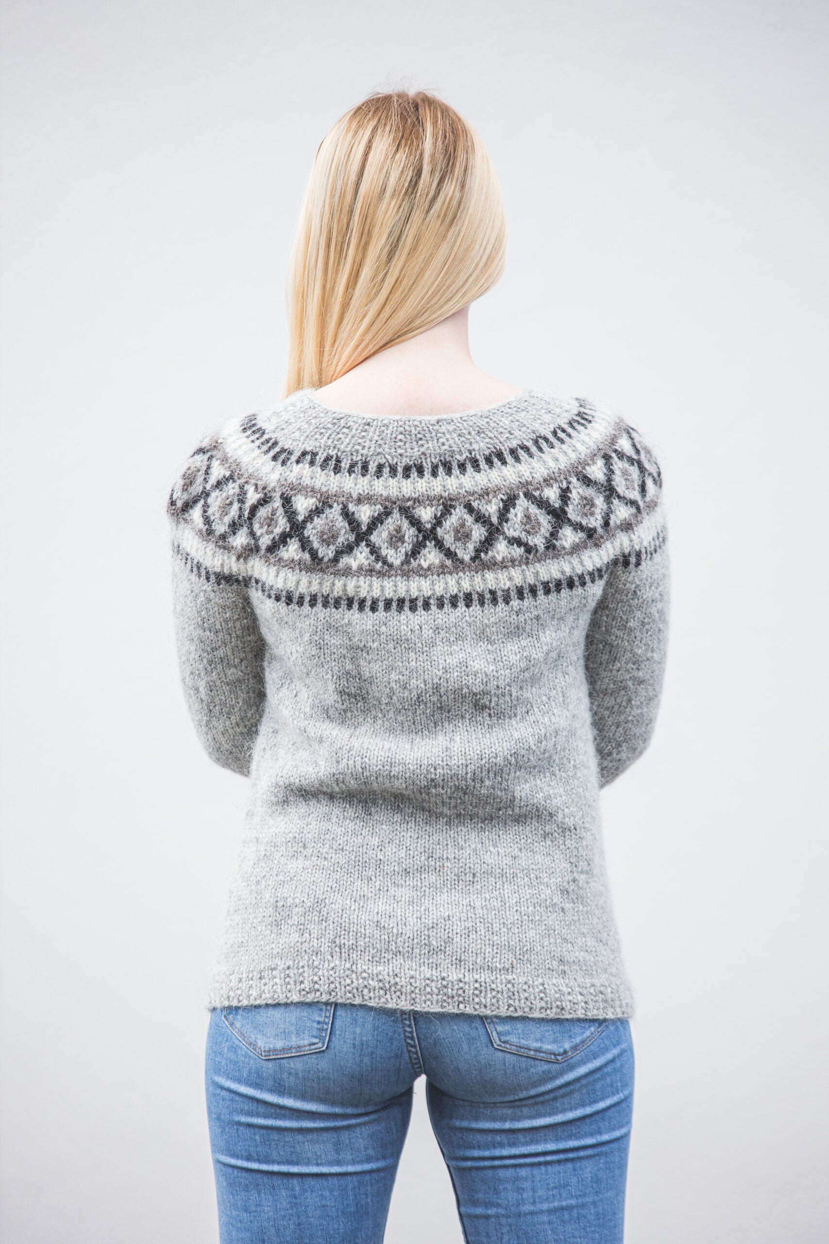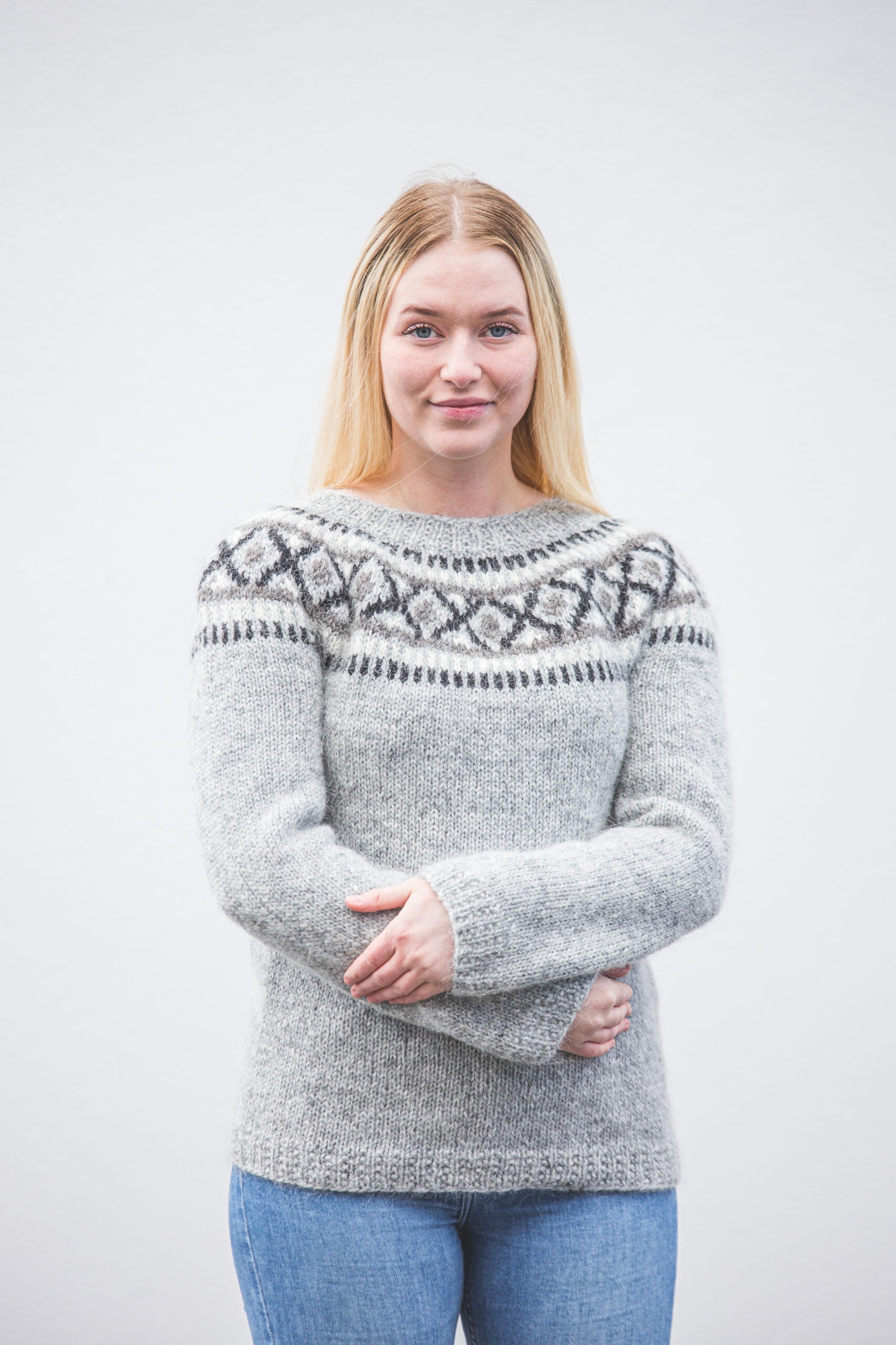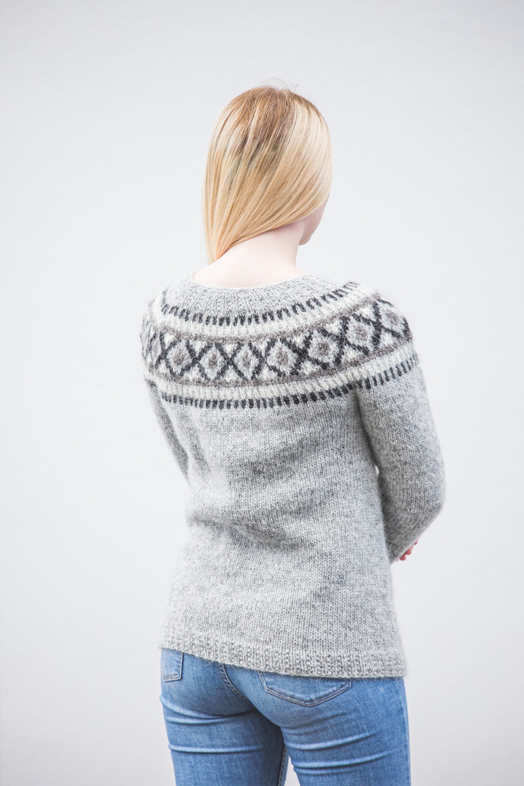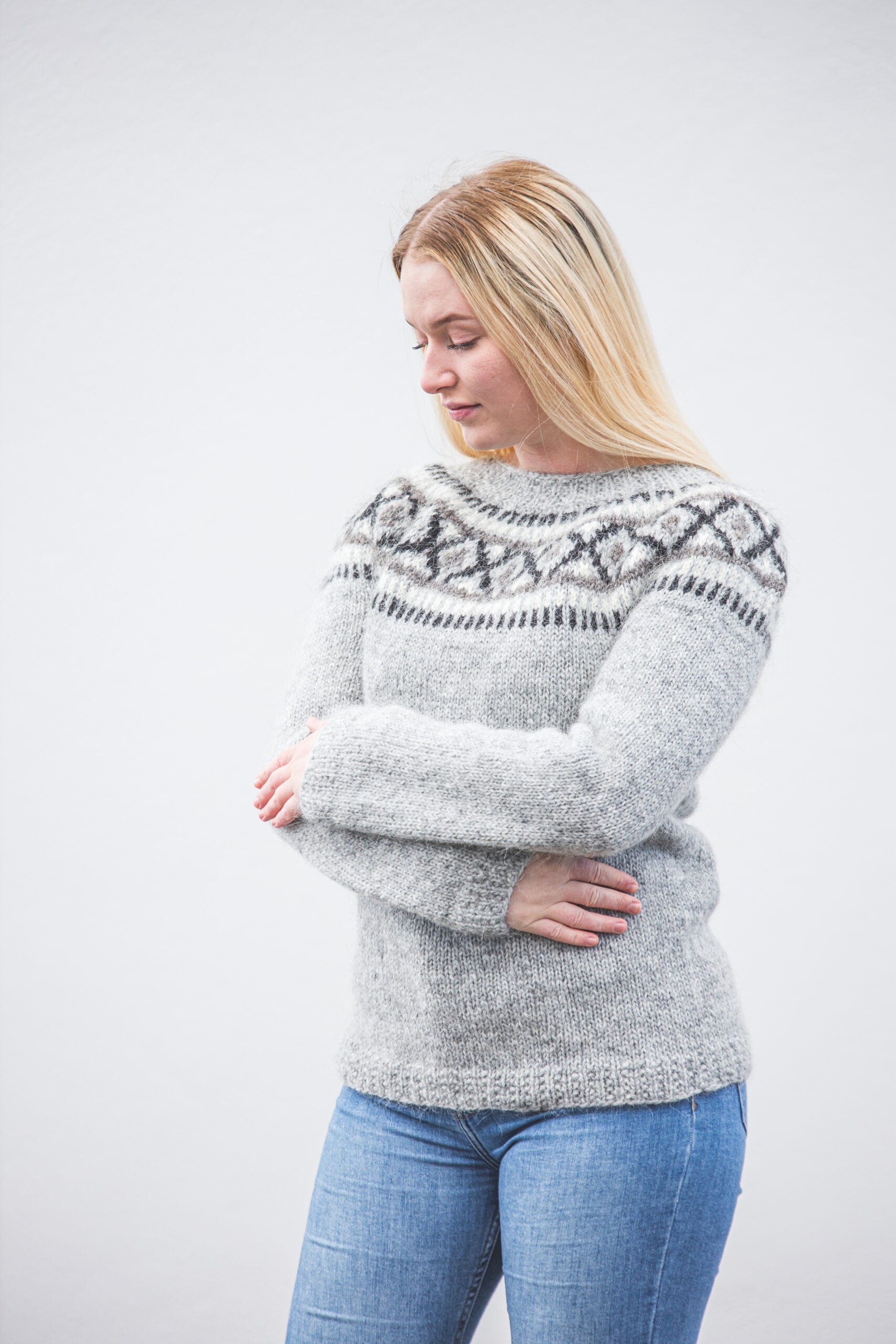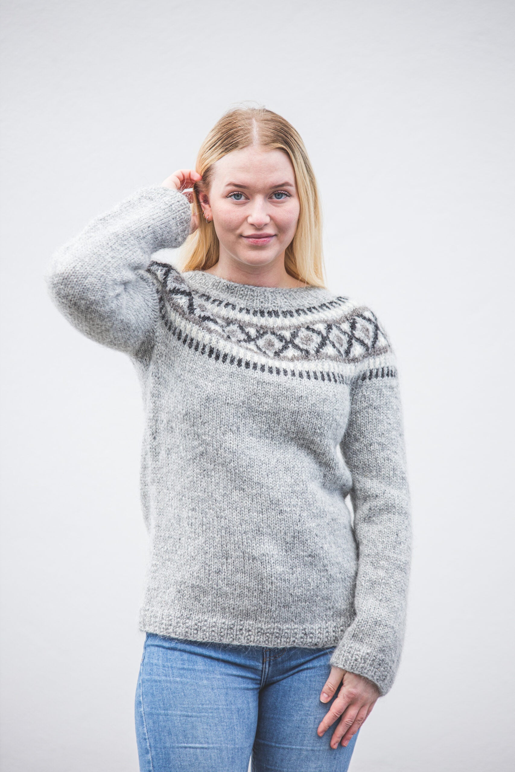 Létt, þægileg og einstaklega klæðileg handprjónuð lopapeysa úr íslenskum plötulopa.