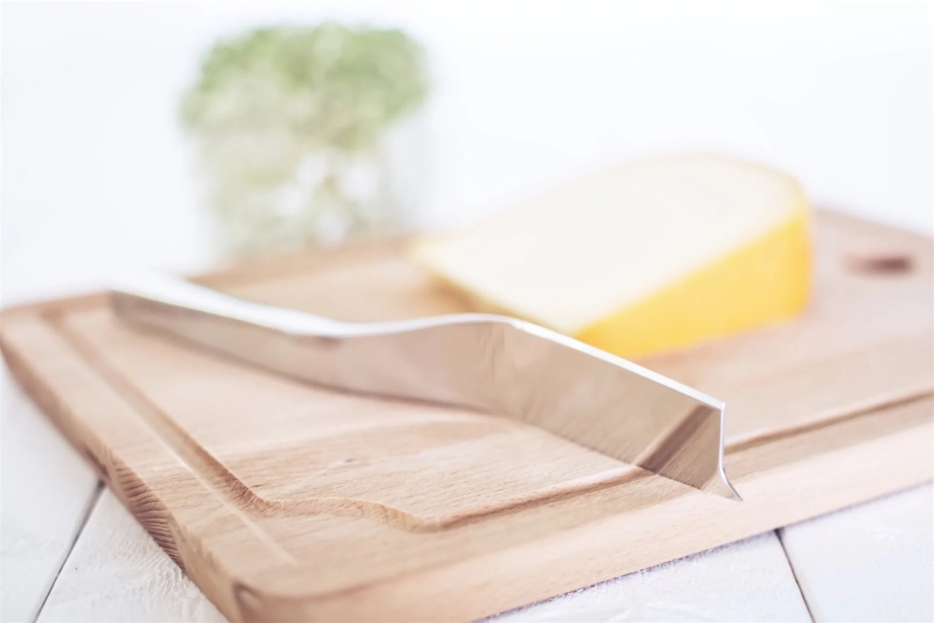 Hnífurinn sker bæði harða og mjúka osta á auðveldan og glæsilegan hátt, og þegar hann er lagður á borðið stendur hann uppréttur þannig að blaðið snertir aldrei yfirborðið. Engar klístraðar slettur eða óhreinar borðplötur – aðeins hreint, fágað útlit.